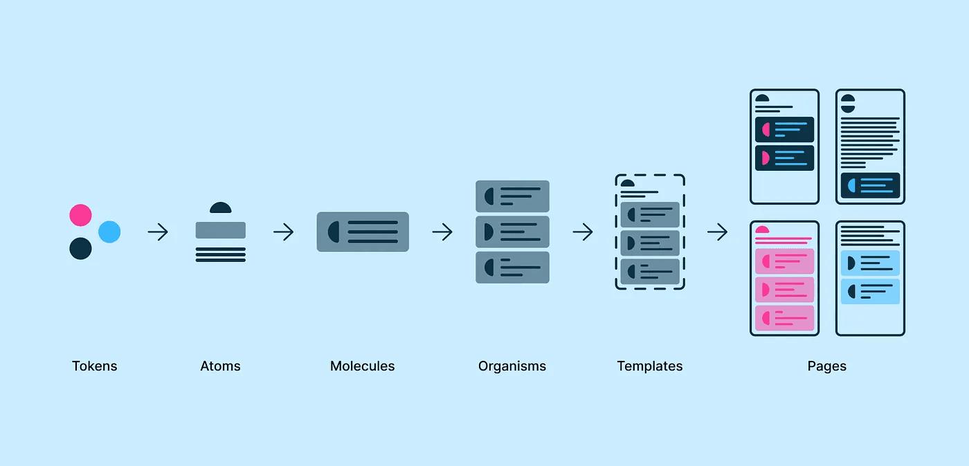 The Atomic Design methodology created by Brad Frost is a design methodology for crafting robust design systems with an explicit order and hierarchy.