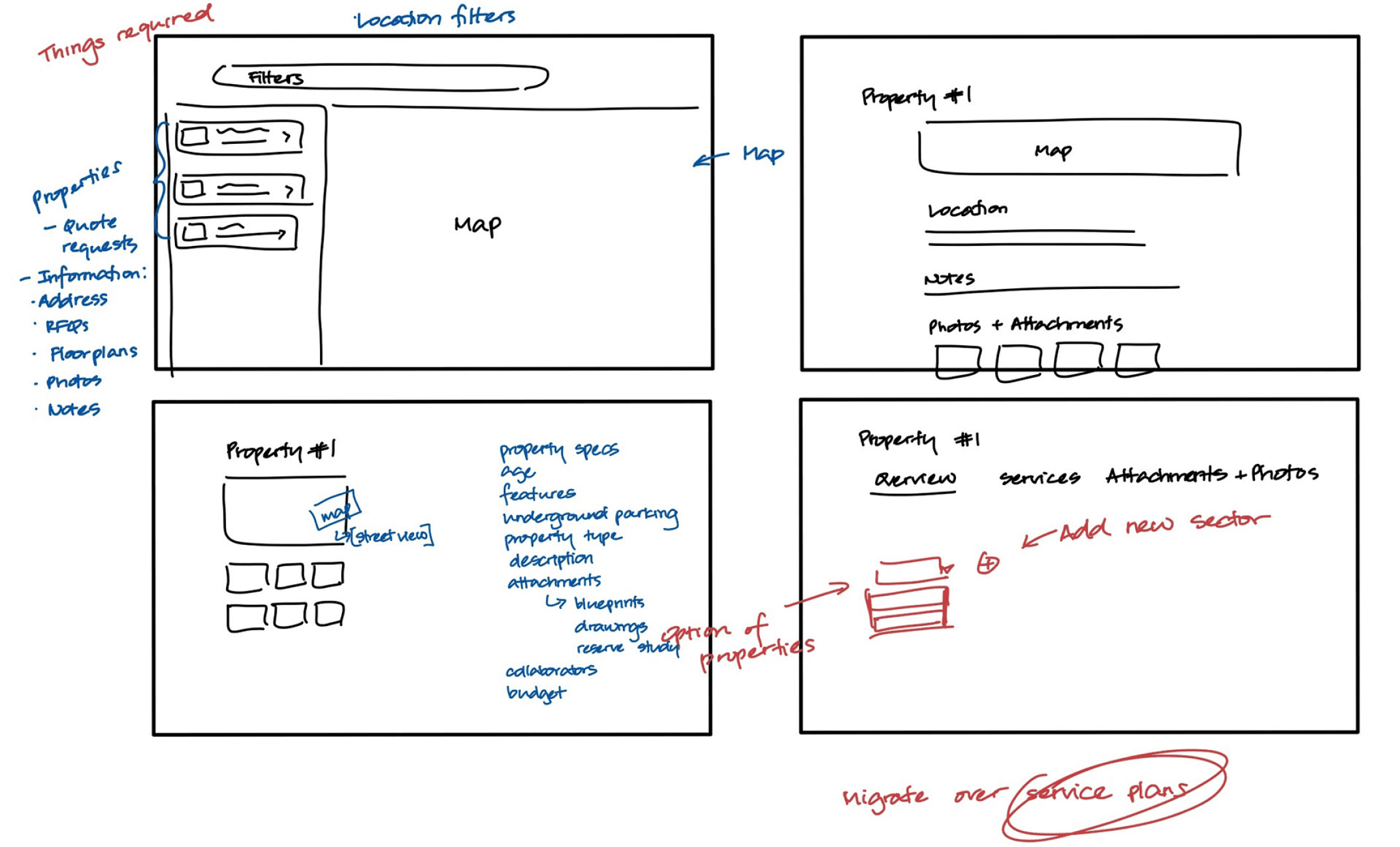 With these goals in mind and the insights gathered from various stakeholders and company clients, I sketched a few low-fidelity wireframes to visualize how I could incorporate these concepts into the Properties page.