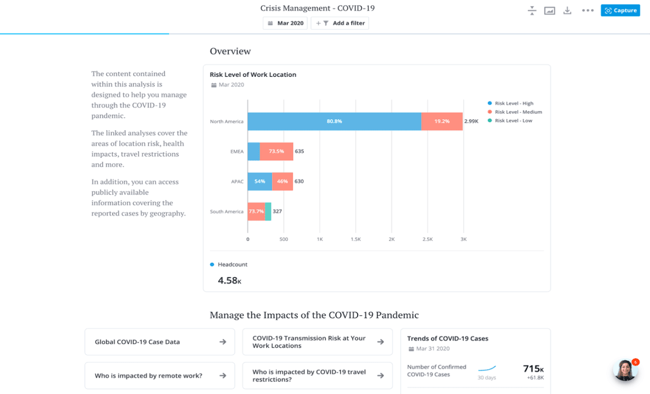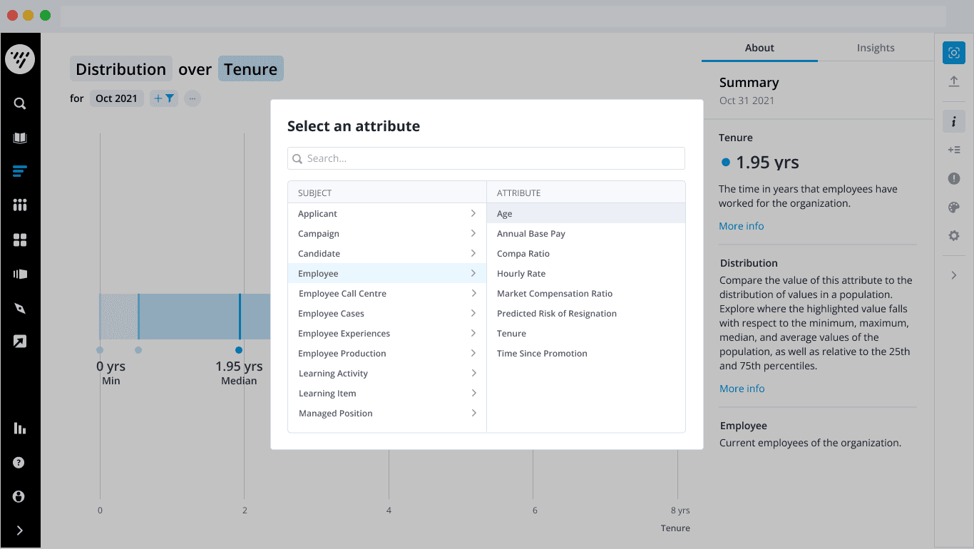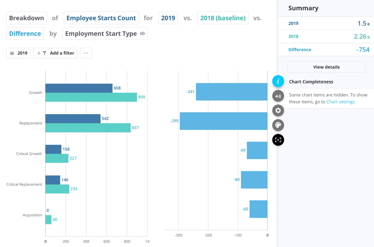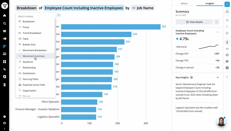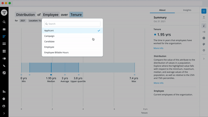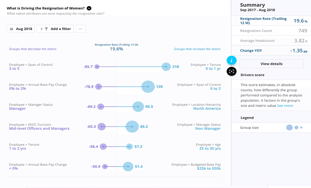 Visier's platform is made up of several features or "rooms" that provides users with access to complex, rich and valuable insights. In the Explore room, users are able to explore a number of different key metrics through several different visualizations.